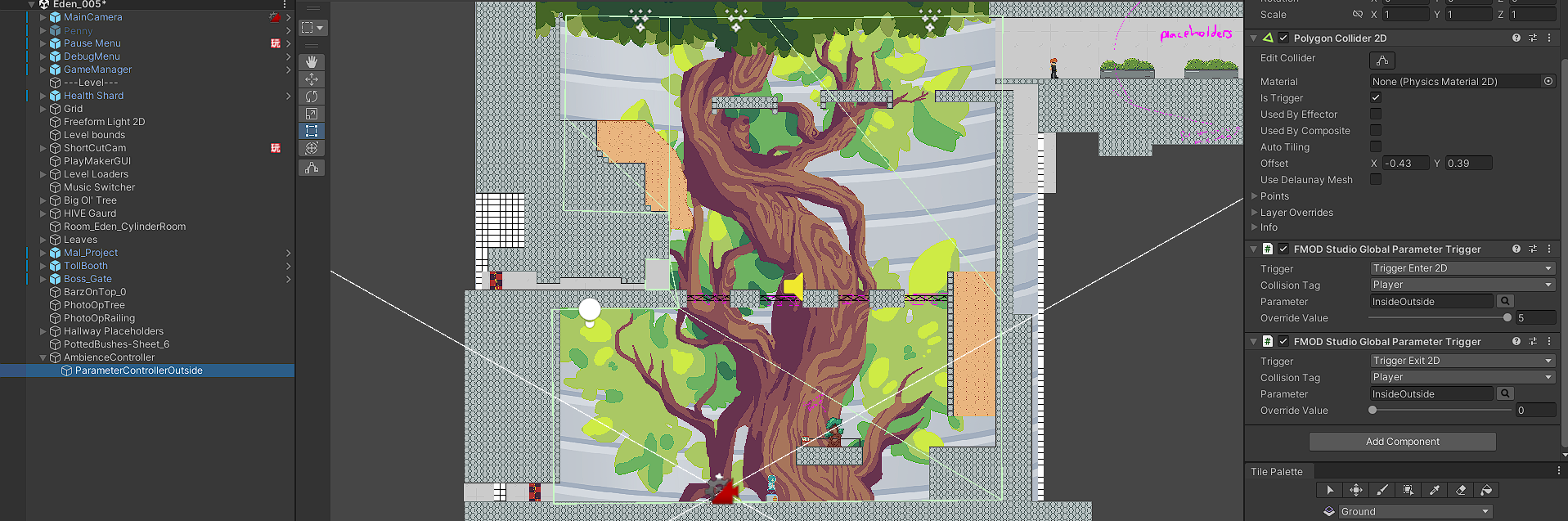 On top of this, there is a randomized scatterer in FMOD that is launching 1 of my 8 wildlife SFX at random intervals. This brings a great amount of life and naturalism into the area. With the variable set between 1 and 5, I can utilize FMOD’s “seek speed” nicely to create a natural-sounding speed for the removal of the low-pass filter. All of this creates a highly immersive and seamless ambience for the player in this room
